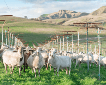The Watson trellis system features a cordon wire at 66–68 inches with an elevated V-shape and 12-foot row spacing. High up on the trellis, vine leaves and fruit are mostly out of reach for grazing sheep. The overhead canopy keeps the vineyard cooler on hot days, reduces frost damage on cold nights, and provides shade for sheep, soil, grapes, people, and wildlife. Growing vines taller allows sheep to browse suckers and shoot tips while making harvest easier – workers pick at eye level rather than stooping.