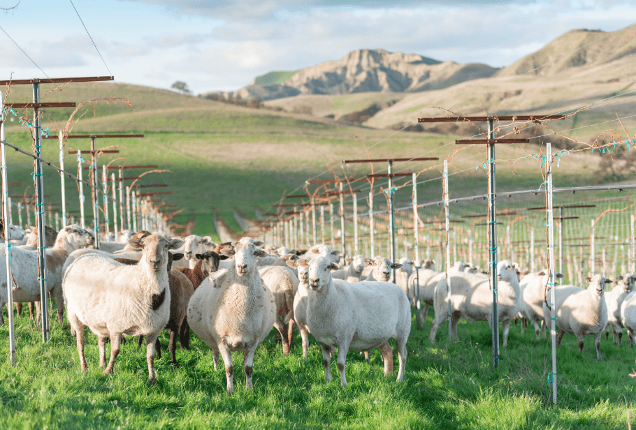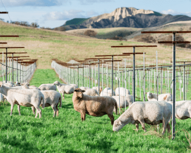 This vision was developed by holistic management educator and viticulturist Kelly Mulville. The vineyard at Paicines Ranch features a unique polyculture system with a partial overhead trellis that allows grazing of the vines year-round. This eliminates the need for tillage, mowing, herbicides, suckering, and hand weeding, while fostering a thriving ecosystem of plants, insects, birds, and soil biology.