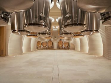The “Acte III: Naissance” project was designed by architect Olivier Chadebost. The architecture combines functionality with design, supporting both the vinification process and the visitor experience. At the core of the structure is a system of inverted, suspended truncated-cone vats. Materials used include high-density raw concrete, stainless steel, and oak.